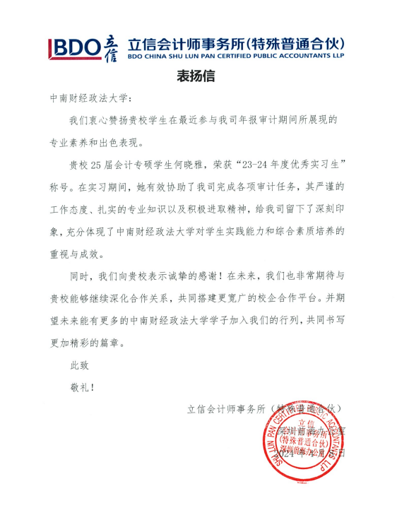(通讯员:张昭妍)近日,会计学院收到一封来自立信会计师事务所(特殊普通合伙)深圳前海办公室的表扬信。我院2023级会计专业硕士研究生何晓雅同学因在实习期间的出色表现,给单位留下了深刻印象,荣获立信会计师事务所(特殊普通合伙)“2023-2024年度优秀实习生”。