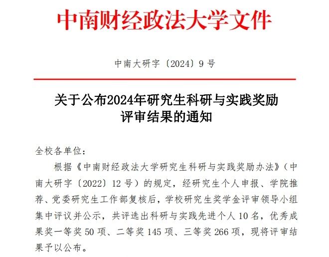 科研沃土育硕果,实践舞台展锋芒。2024年7月1日,学校正式公布2024年研究生科研与实践奖励评审结果,经研究生个人申报、学院推荐、党委研究生工作部复核后,学校研究生奖学金评审领导小组集中评议并公示,共评选出科研与实践先进个人10名,优秀成果奖一等奖50项、二等奖145项、三等奖266项。