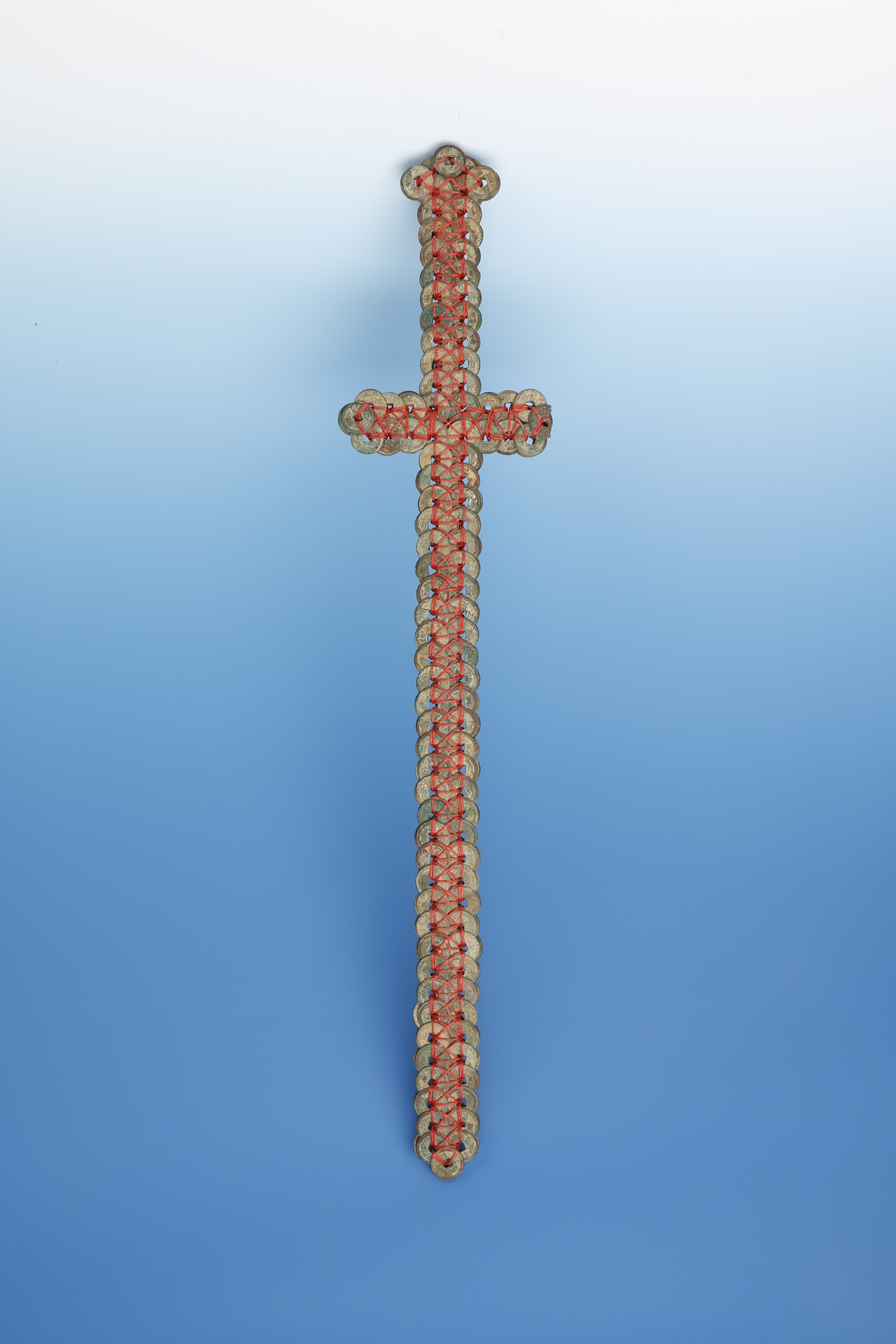 青蚨剑:据晋代《搜神记》记载,有一种名叫青蚨的小虫,幼虫无论被藏在何处,母虫都能将它找到。如用母虫和幼虫的血涂在不同的钱上,这两枚分开使用的钱币也最终能够重聚 ,这就是 “青蚨引钱” 的传说。明清时期,文人 雅士们融汇贯通,将前朝古钱用绳 索穿成剑形悬挂于堂室之中,并根据古代神话“青蚨引钱”的传说,取名为“青蚨剑”,有祈福、消灾、镇宅、除邪、护财的寓义。