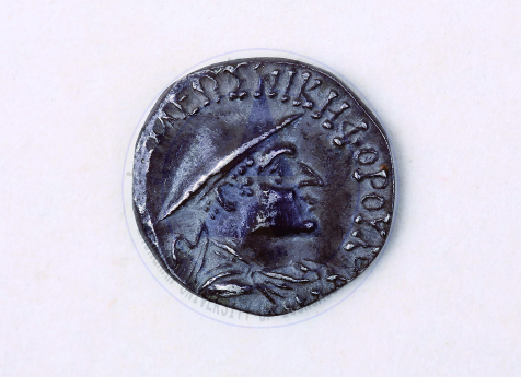 巴克特里亚王朝的钱币有金、银、铜三种,为希腊式打制币,形状有圆形与方形,正面国王头像无胡须,为希腊传统,并有希腊文铭文,背面为宙斯坐像,并有佉卢文铭文。