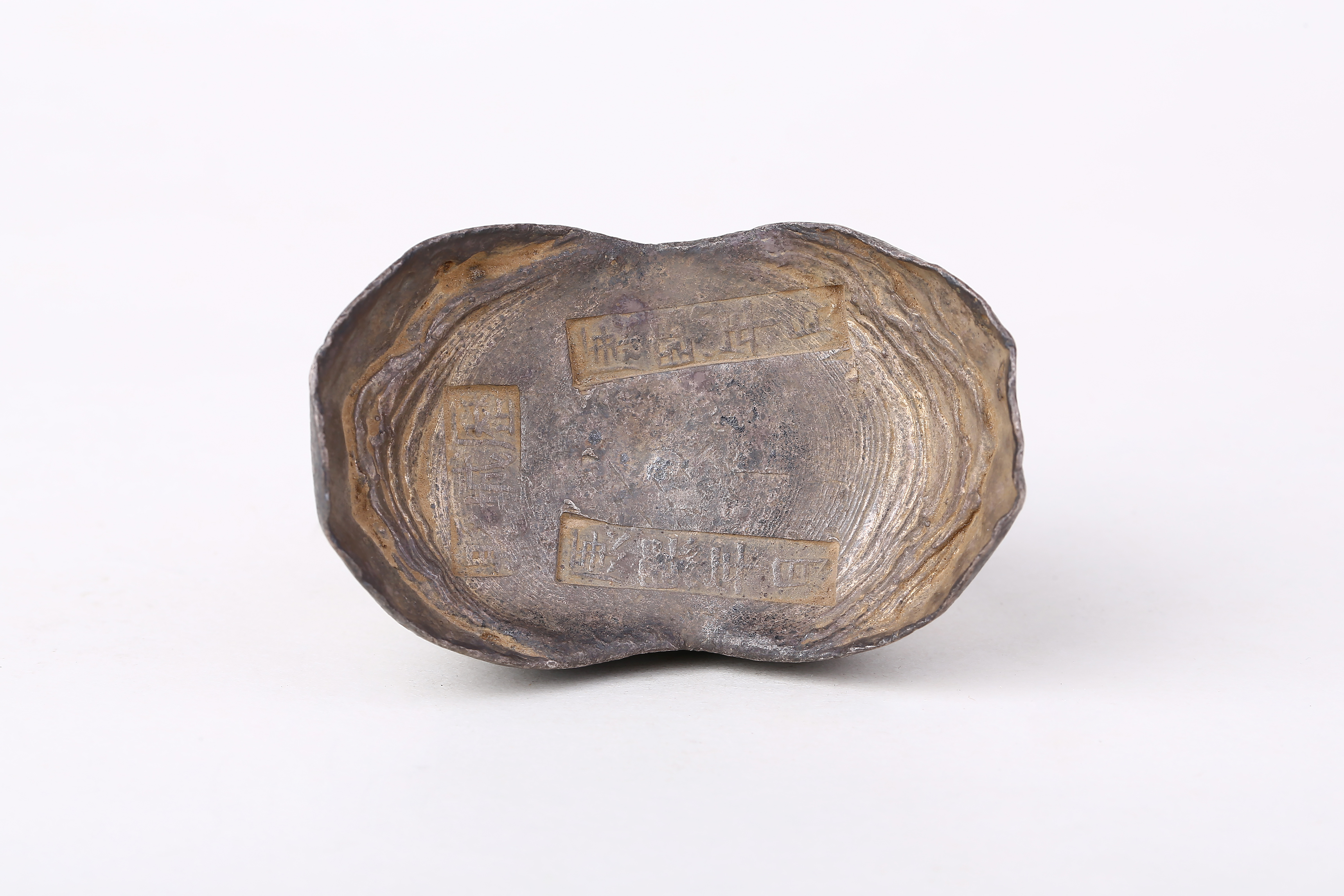 中国古代的白银货币以银锭为主要形态,使用时需称重并计算成色。清朝银锭主要有五十两与十两两种规格,五十两银锭主要用于政府税收、贮藏与民间大额贸易,十两银锭主要用于民间小额交易。此为清代康熙年间山东历城县铸造的十两银锭,表面打有“康熙年月”、“历城县”戳记。