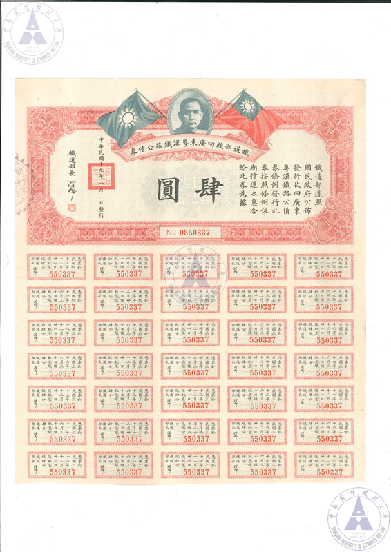 中华民国 铁道部收回广东粤汉铁路肆圆公债券