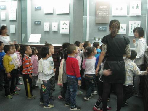 2011年10月19日上午九点多,校幼儿园40多个可爱的小朋友在老师们的带领下到我馆参观。孩子们多为5岁多,不论是从心智还是知识结构方面来说,对“钱”的理解都是非常粗浅的,针对这一特点,我馆讲解员苏婷婷尽量从孩子的兴趣和思维出发,带着他们游览了一遍我馆,让孩子们对贝币、布币、刀币以及圆形方孔钱等有了一个大概的印象,并以孩子们能够理解的语言,跟他们简短地讲了有关货币的故事。