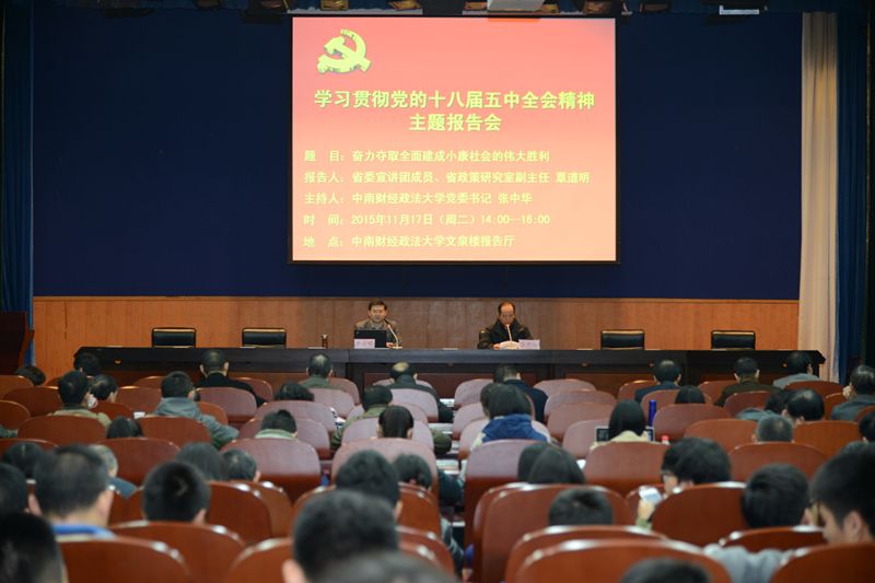 新闻网讯(学生通讯员 钱雅纯 胡政中 康帅 摄影 徐志持)为学习贯彻党的十八届五中全会精神,11月17日,学校在文泉楼报告厅举行了 “奋力夺取全面建成小康社会伟大胜利”的主题报告会。湖北省人民政府研究室副主任、党组成员、湖北省委宣讲团成员覃道明教授,从新背景新使命、新形势新纲领、新理念新发展、新责任新角色四个方面,立足于湖北省的现实情况,全面解读了五中全会精神。校党委书记张中华,校党委副书记齐文远、王文贵,校长助理邹秉国,各二级单位副处级以上干部、校机关科级干部,各级人大代表、政协委员、政府参事,各民主党派正副主委、校侨联负责人,离退休党委正副书记、校老协正副会长,各系正副主任、各教研室主任、各研究所负责人,党支部书记,各学院学办主任、分团委书记,马克思主义学院全体教师以及学生代表参加会议。会议由张中华书记主持。