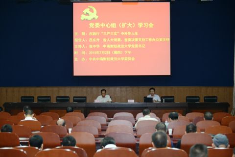 新闻网讯(记者 徐剑飞)7月2日下午,学校在文泉楼报告厅召开党委中心组(扩大)学习会。湖北省人大常委会委员、省委决策支持工作办公室主任吕东升在学习会上作题为《在践行“三严三实”中升华人生》的专题报告。校党委书记张中华,校党委副书记、纪委书记齐文远,总会计师王建鸿,副校长姚莉、陈明等校领导参加学习会。学校党委委员、纪委委员,全校副处级以上干部,各职能部门和直属单位科级干部以及各教工党支部书记参加学习。学习会由张中华书记主持。