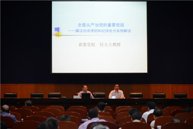 新闻网讯(学生记者 许浩浩 通讯员 徐悠扬)6月7日下午,学校在文泉学术报告厅组织召开《中国共产党廉洁自律准则》《中国共产党纪律处分条例》(下文均简称为《准则》《条例》)学习辅导会。校党委书记张中华、党委副书记齐文远、王文贵出席了本次会议,全校副处级以上干部,机关科级以上干部参加。本次会议由湖北省委党校建研究中心副主任任大立教授主讲,齐文远主持会议。