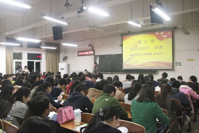 新闻网讯(学生记者 王晓晓 郭媛元 黄俊翔)11月2日晚19:00,工商管理学院第22期分党校开课典礼于文澜110室举行。校长杨灿明教授为工商学院党员、预备党员及发展对象讲授题为《四讲四有之讲道德有品行》的第一课。工商管理学院党委书记王华路、组织委员刘淑君,以及学办辅导员参加此次讲课,王华路担任主持。