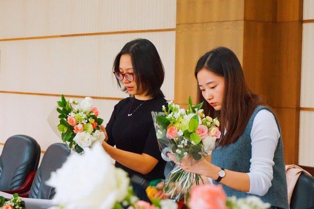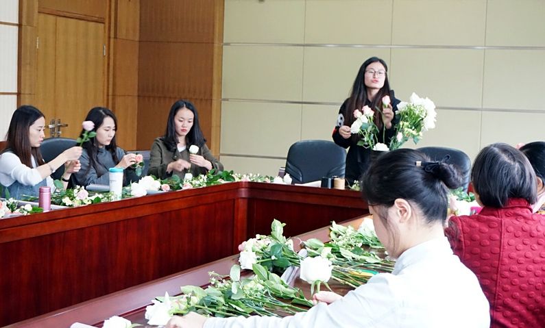 党办、校办工会小组特邀花店高级讲师现场指导,凭借花艺老师多年的花艺底蕴以及工作经验,生动形象地教授了花艺知识与插花技巧,介绍了插花的造型、色彩、应用要点,并现场制作演示。通过花艺老师用心传授,女教职工们初步学习了一些基本花材,了解了插花制作的简单技巧及花艺的美学鉴赏知识。在明快活泼的气氛中,女教职工们现场实践,在专家的精心指导下,凭借每个人对美的不同理解,并结合学到的知识;原本普通的花草经过组合、修剪、搭配、点缀、包装变成了多姿多彩、别具一格的花艺作品。捧着花艺作品的女教职工们合影留念,并带回自己制作的花束用于装点办公环境。本次插花活动获得大家一致好评,认为活动浪漫、温馨,既可以修身养性,陶冶情操,又能近距离接触自然,直言花艺让生活变得更美好。