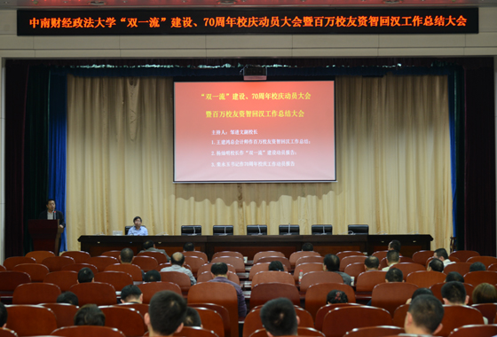 10月27日下午,学校在文泉楼报告厅召开70周年校庆动员大会暨百万校友资智回汉工作总结大会。校党委书记栾永玉、校长杨灿明、校党委副书记万清祥、总会计师王建鸿、副校长陈明出席会议,副校长邹进文主持会议。