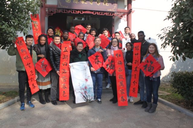 团拜会举行之前,国际教育学院举行了留学生春节传统年俗体验活动。在校留学生和教师一起写春联、画国画、吃年饭,共贺中国狗年新春。留学生在书法指导老师熊治国和国画老师马幼兰的指导下,体验各项不同的传统年俗艺术,师生们其乐融融,节日的气氛感染了现场所有人。