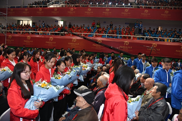 9时30分,在我校1948级校友、新中国第一位交响乐女指挥家、厦门爱乐乐团艺术总监兼首席指挥、89岁的郑小瑛女士指挥下,全场同声高唱中华人民共和国国歌。在雄壮的国歌声中,纪念大会正式开始。随后,学生代表向老教授、老校友代表一一献花,以示“大学之大,在大师之大,大学之美,在桃李芬芳”,表达对广大教师辛勤耕耘、精心育人,对广大校友建功立业、砥砺奉献的敬意和感谢。
