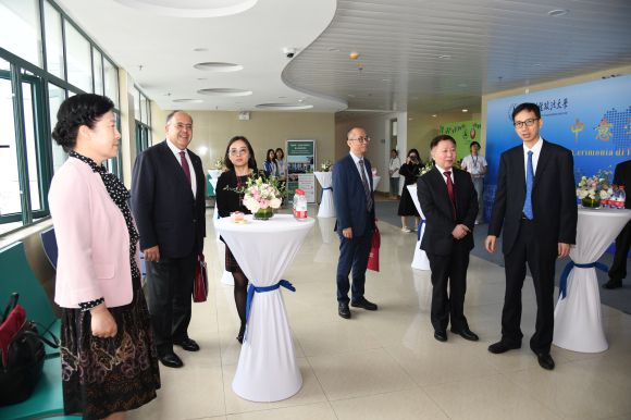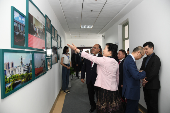 在揭牌仪式之前,中意双方在文澴楼7楼会议室举行了校长会谈。双方就合作历史进行了回顾,并就中意学院建设事宜进行了讨论,就不断深化合作关系,拓展合作领域,实现合作共赢进行了沟通和交流。会上,杨灿明校长为高迪奥校长颁发了聘书,聘请高迪奥校长为我校客座教授。座谈会后,与会嘉宾一同参观了位于文澴楼六楼西侧的中意学院及我校与罗马一大交流成果展。