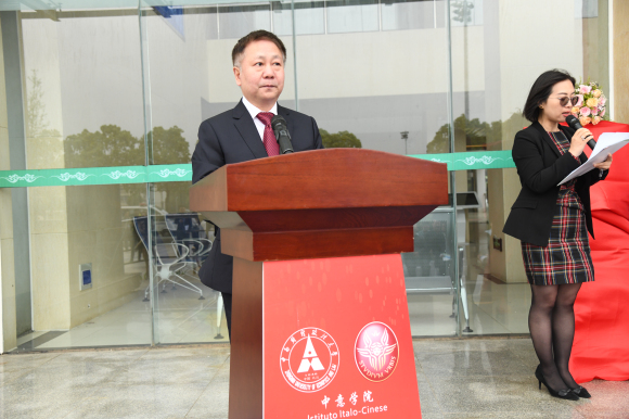 又讯(学生记者 赵颖 叶莎莎 陈丽羽)为庆祝中意学院成立,学校于4月26日晚在艺体中心音乐厅隆重举办“融情共筑梦,中意谱新篇”晚会。罗马第一大学乌杰尼奥·高迪奥校长、布鲁诺·波塔副校长、奥利维耶罗·迪利贝托教授,我校党委书记栾永玉、校长杨灿明分别代表中意双方登台进行联合致辞,传达中意两国日久经年的友谊,表达两校将携手建设中意学院的期待。