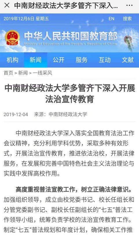 教育部网站以“米兰电竞·(中国区)多管齐下深入开展法治宣传教育”(http://www.moe.gov.cn/jyb_xwfb/s6192/s133/s203/201912/t20191204_410849.html)一文,全面系统的介绍了学校“七五”普法期间,通过“高度重视普法宣教工作,树立正确法律意识;建立三级教育梯次,确保普法学习效果;坚持学用结合学以致用,提高依法治校水平;开展对外法律服务活动,促进法治社会建设”等举措,扎实开展法制宣传教育工作的有关情况。