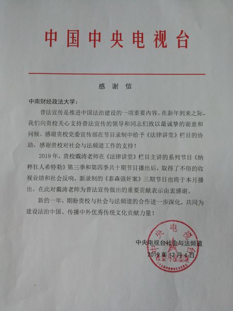 中央电视台社会与法频道给学校发来感谢信,信中肯定了学校在主讲人选拔、节目录制播出、联合推广等方面提供的支持,尤其是对《法律讲堂》栏目的支持,高度评价学校戴涛老师2019年在该栏目所录制节目的社会反响。学校与央视社会与法频道自2011年开始合作,推选出戴涛、夏朝晖等老师作为主讲人,戴涛从2011年至今已经录制100多期节目,是该栏目的知名主讲人。