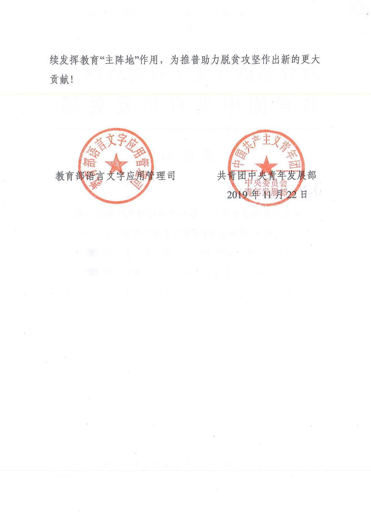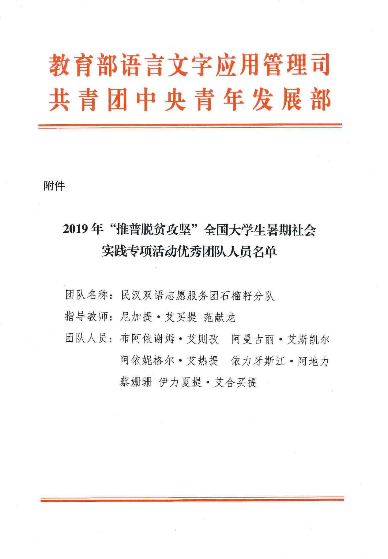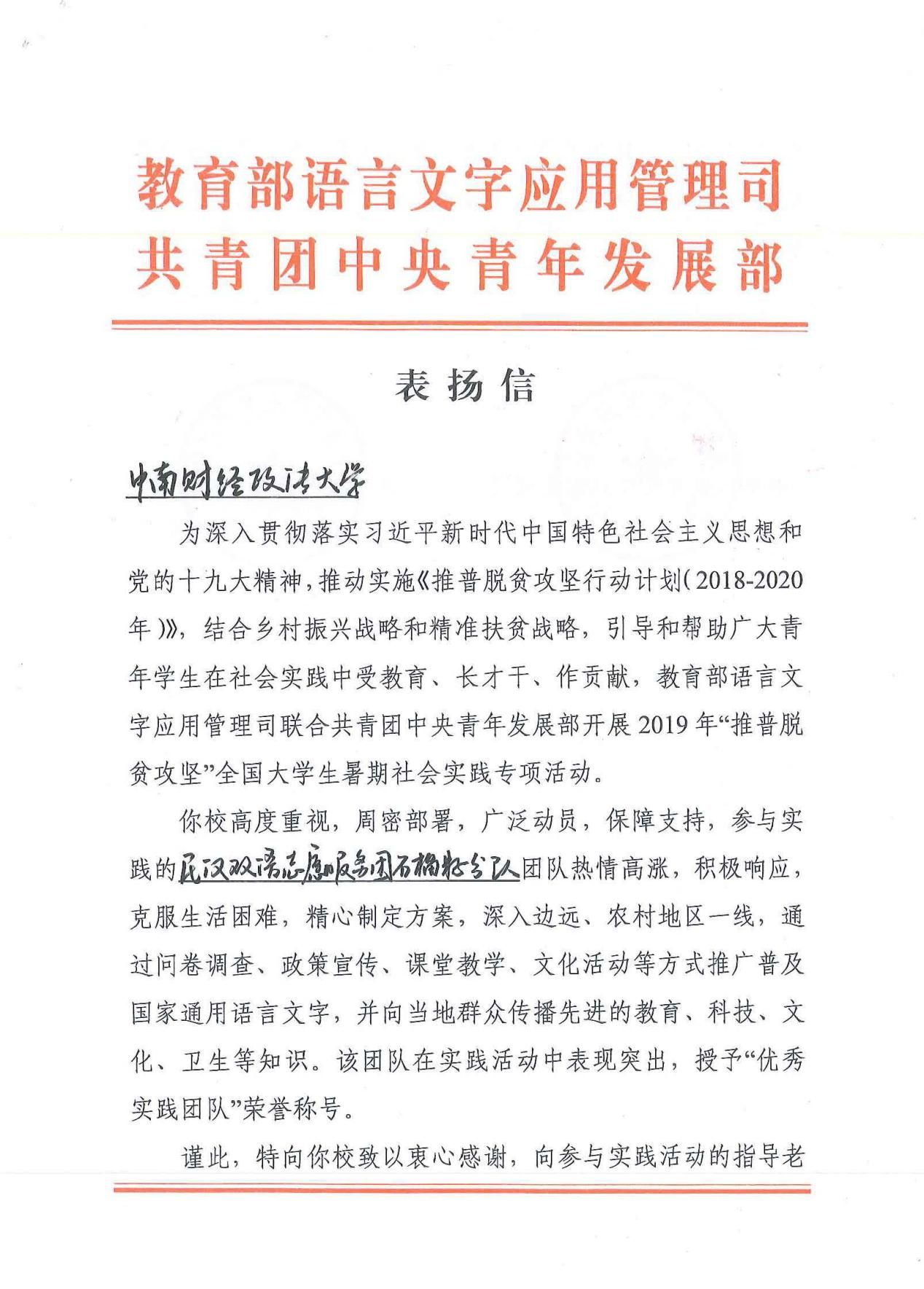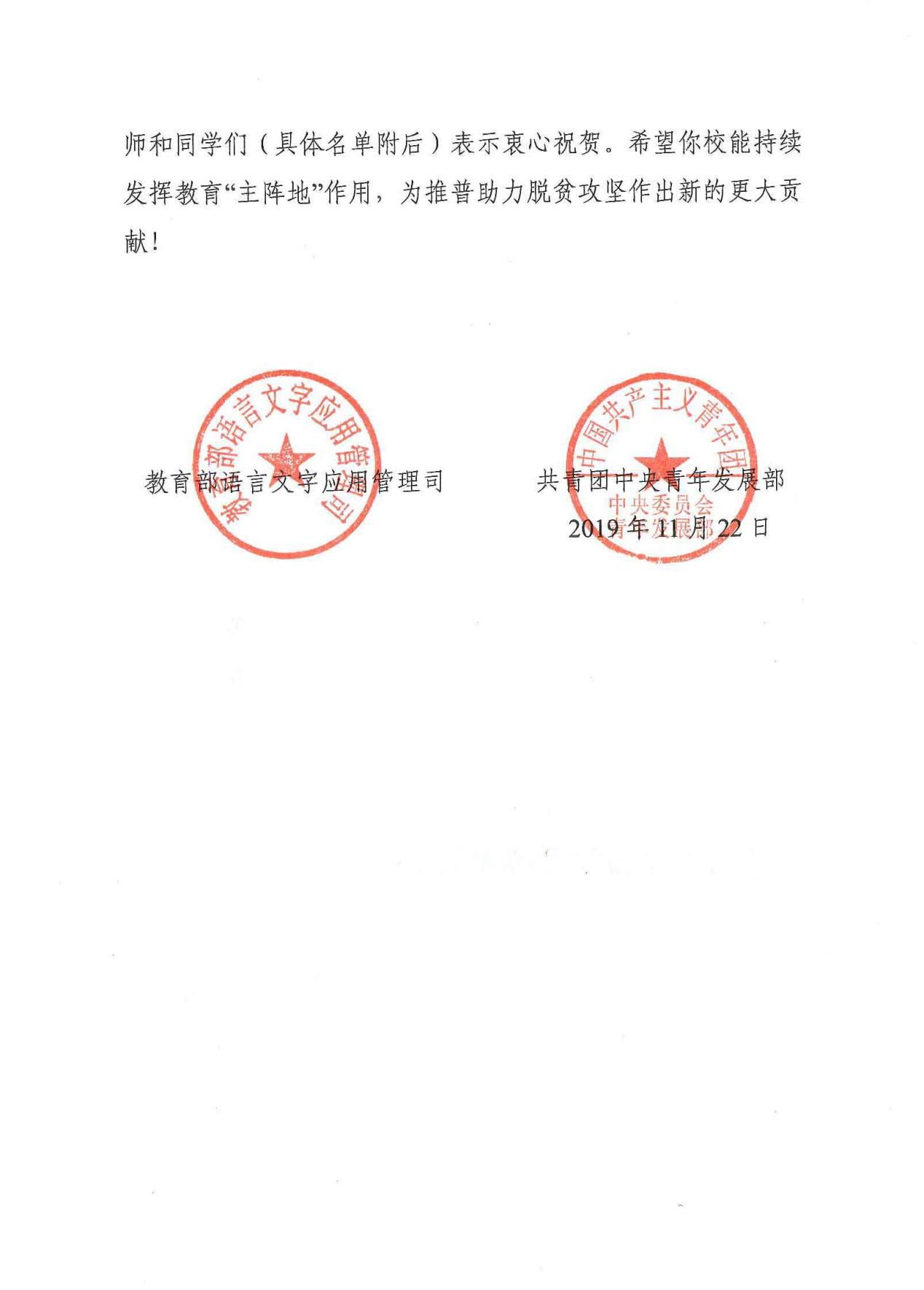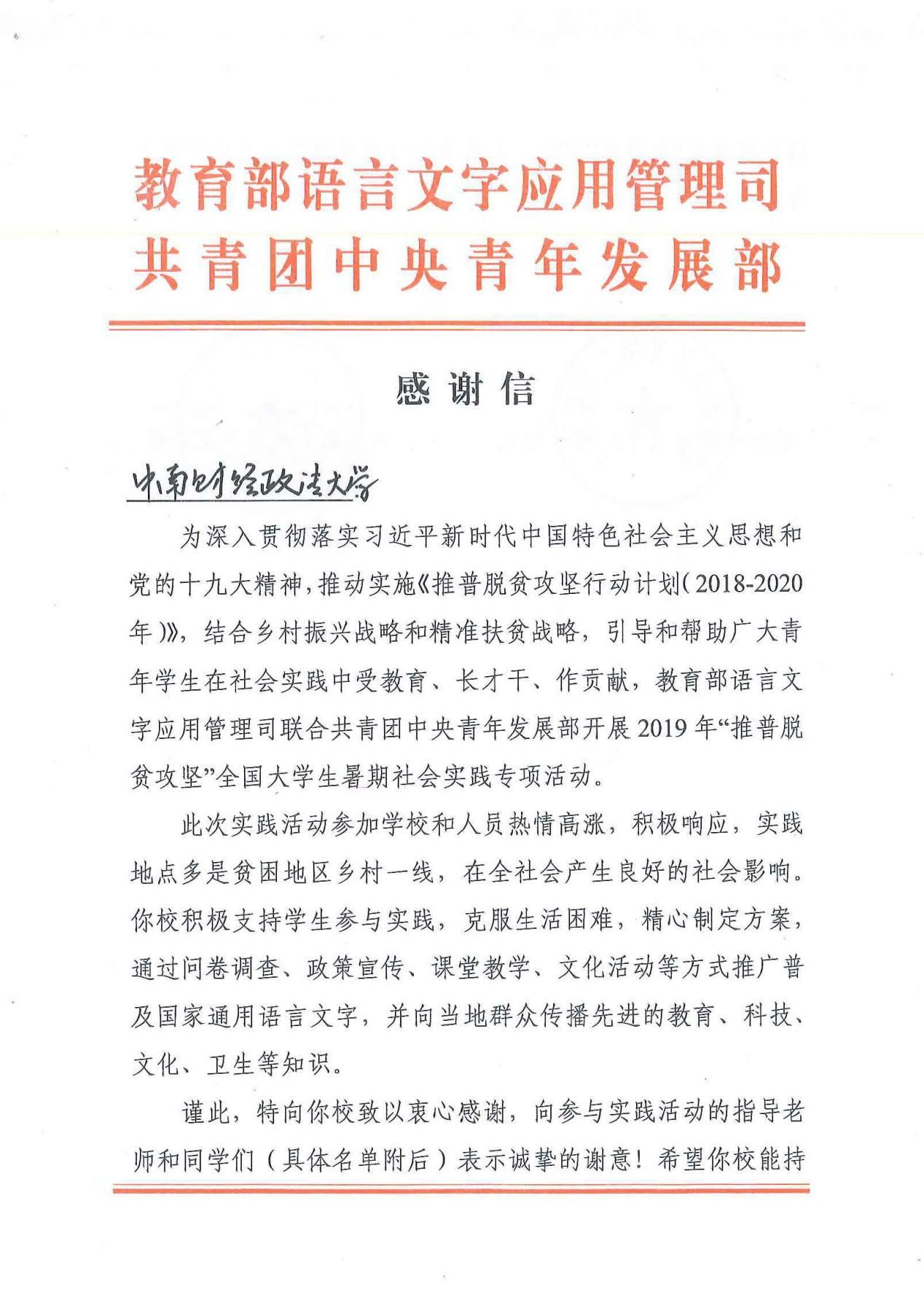 新闻网讯(通讯员 蔡姗珊)近日,教育部语言文字应用管理司和共青团中央青年发展部向我校发来表扬信和感谢信。表扬信提到,你校高度重视,周密部署,广泛动员,保障支持。参与实践的民汉双语志愿服务团石榴籽分队团队热情高涨,积极响应,克服生活困难,精心制定方案,深入边远、农村地区一线,通过问卷调查、政策宣传、课堂教学、文化活动等方式推广普及国家通用语言文字,并向当地群众传播先进的教育、科技、文化、卫生等知识。该团队在实践活动中表现突出,授予“优秀实践团队”荣誉称号。谨此,特向你校致以衷心感谢,向参与实践活动的指导老师和同学们表示衷心祝贺。希望你校能持续发挥教育“主阵地”作用,为推普助力脱贫攻坚作出新的更大贡献!