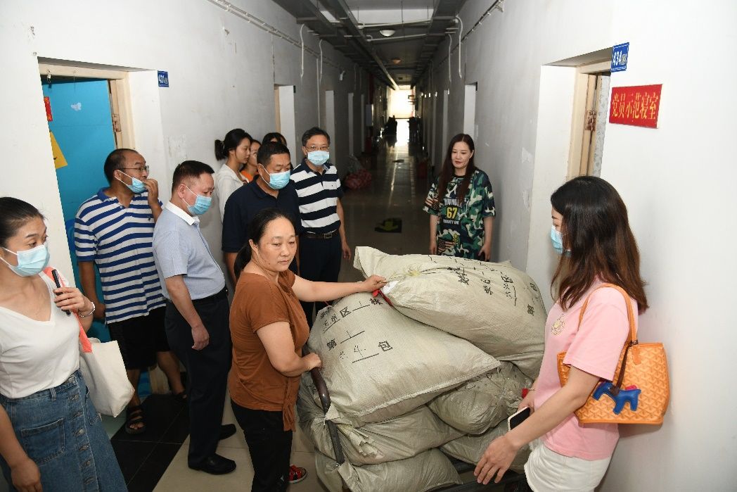 随后,校领导一行来到滨湖宿舍区法学院19级学生寝室看望刚刚返校搬迁至南湖校区的学生。法学院党委主要负责人参加活动。校领导高度评价了搬迁工作,向冒着酷暑搬迁的工作人员表示慰问。宿舍楼下,吊车正在将写有寝室编号的学生行李运送至四楼寝室。在四楼走廊,工作人员正用小推车将行李运送至对应的学生寝室。宿舍外一片热火朝天,宿舍内同学们都在忙着复习备考。