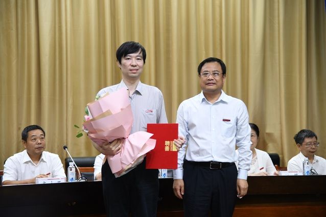校党委副书记陈明宣读2019-2020年我校新增各类高层次人才名单。杨灿明校长与高层次人才代表钱学锋教授签约,人才办公室主任陈柏峰与湖北有关高层次人才计划代表任宇教授签约。与会校领导分别为以上人员颁发证书或聘书。