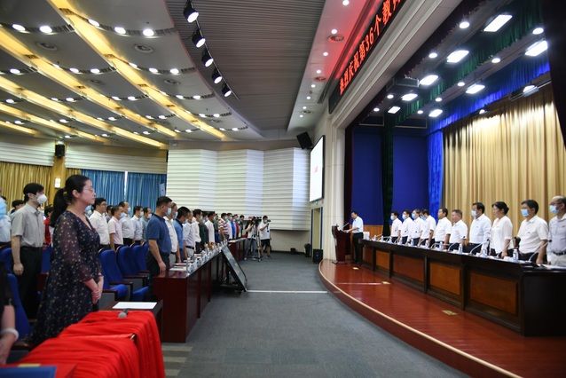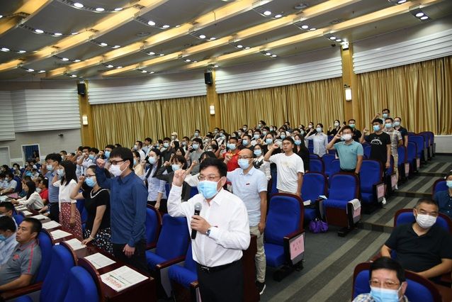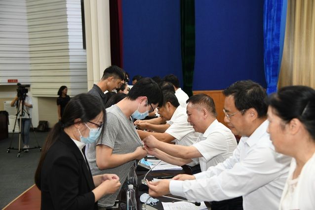 校党委常委、副校长刘仁山带领新进教职工就职宣誓,庄重的誓言回荡在整个报告厅,宣誓完成后由全体校领导为新进教职工代表佩戴校徽,表达了学校对各位新进教职工热烈欢迎。