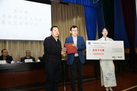 会上,郭道扬教授学生代表曹大宽向我校捐款100万元用于会计史文博馆建设。栾永玉书记代表学校接受捐款。