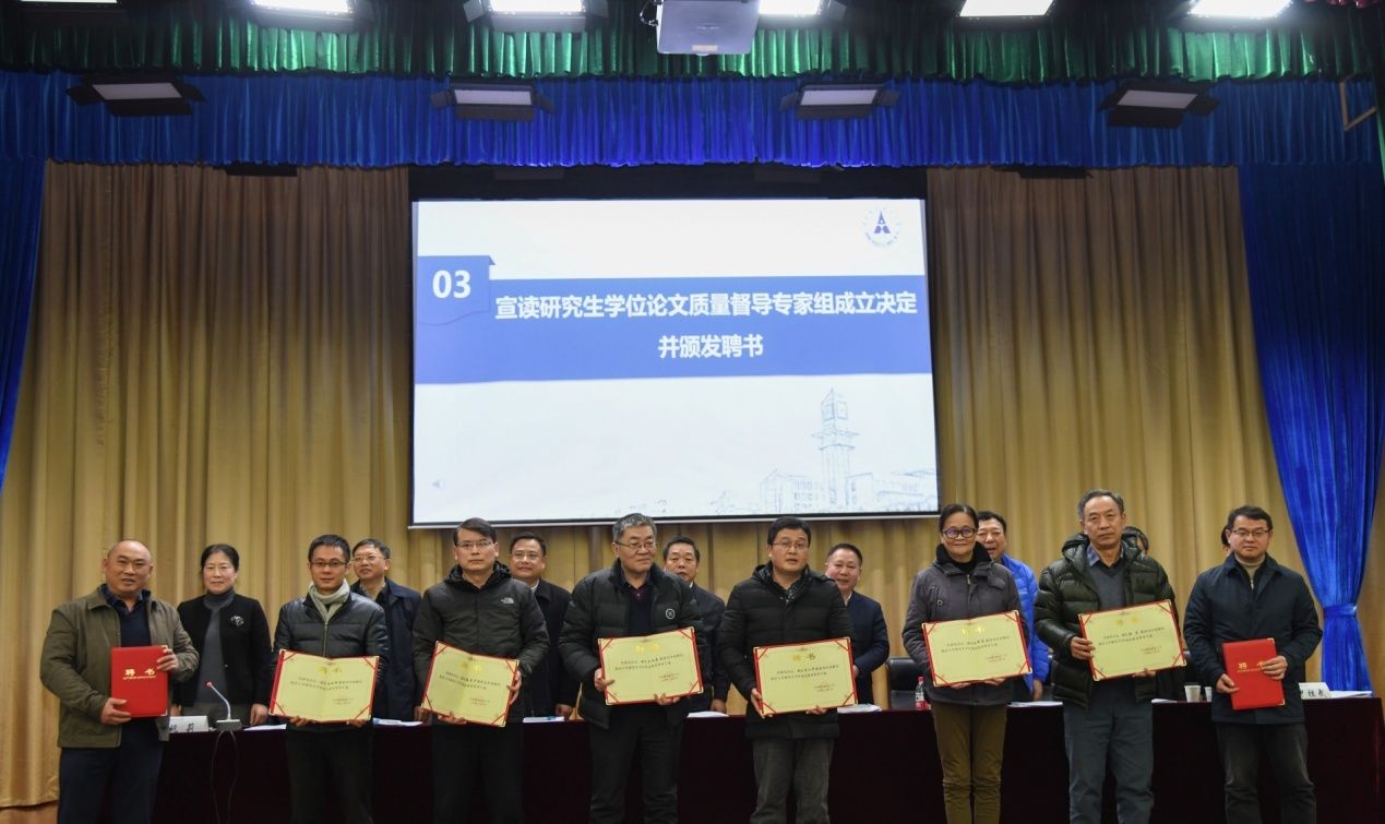 为进一步提高研究生培养质量,学校决定成立研究生学位论文质量督导专家组。覃红在会上宣读了该决定。王雨辰、石智雷、朱新蓉、李小平、张龙平、张克中、张虎、陈柏峰、钱学锋等九位教授受聘为我校首批研究生学位论文质量督导组专家。出席会议的校领导分别为专家组成员颁发聘书。