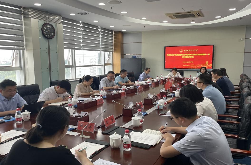 新闻网讯(通讯员:余秋廷)6月7日上午,中南民族大学党政办主任陈强胜,副主任贺展、郭聪,各相关科室负责人一行8人来访,就办公室业务工作在中原楼5楼会议室进行调研座谈。我校党办校办主任兼督察办主任刘建明,法务部部长张忠民,党办校办副主任曹吉安,督察办副主任、法务部副部长刘筱彤出席,各科室负责人参加座谈会。会议由张忠民主持。