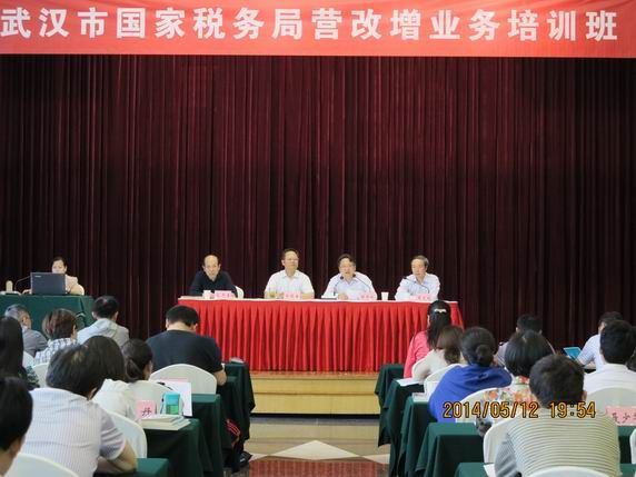 武汉市国税局营改增业务培训班于2014年5月13日上午在汉口市国税局培训中心开学,武汉市国税局郑俊生副局长,我校继续教育学院谢进城院长,培训教育学院彭晓霞院长,市国税局教育处熊志勇处长、货物与劳务处周文福处长等出席了开学典礼。