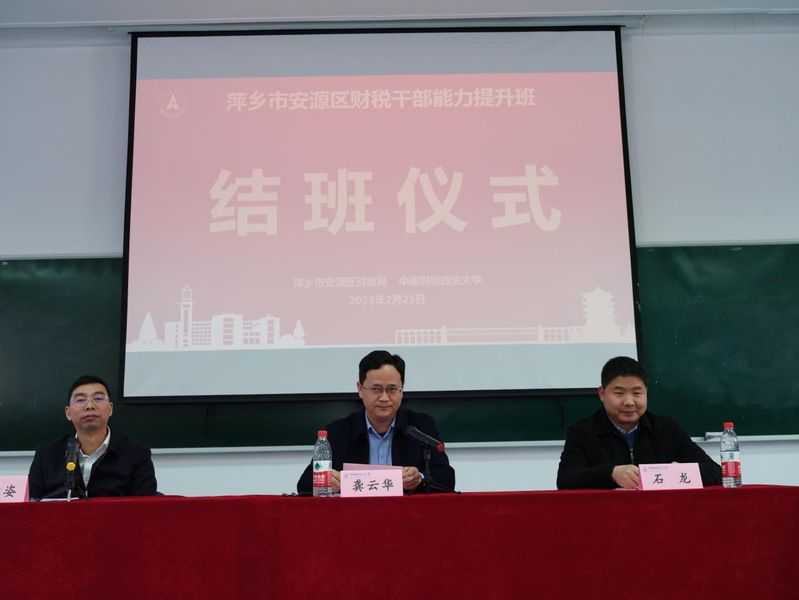 2023225日下午,由江西省萍乡市安源区财政局主办,校承办的2023年安源区财税干部能力提升班”在首义校区圆满完成,共有59名学员顺利结业。萍乡市安源区委常委、区政府党组副书记、常务副区长龚云华,学校继续教育学院副院长石龙和萍乡市安源区财政局党组书记、局长吴雄姿出席了结业仪式
