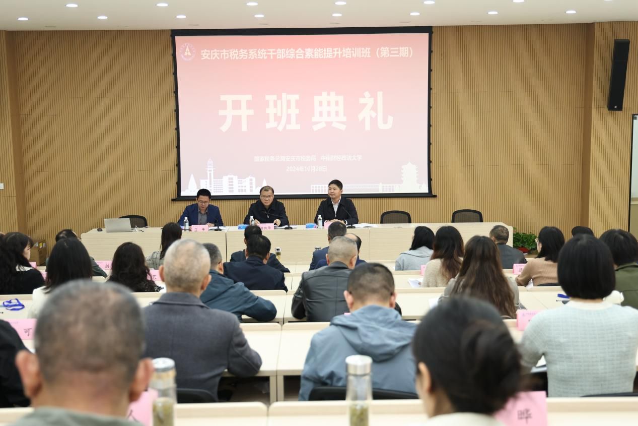 2024年10月28日,安庆市税务系统干部综合素能提升培训班(第三期)在我校首义校区顺利开班,共47名来自安庆市税务系统的学员参加了培训。国家税务总局安庆市税务局二级高级主办查凯华,学校继续教育学院副院长石龙共同出席了开班仪式。