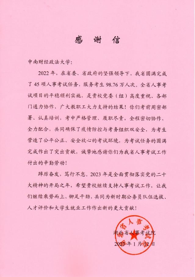 宝剑锋从磨砺出,梅花香自苦寒来。艰难付出也收获了累累硕果,湖北省人事考试院、武汉市人事考试院、武汉市招生考试办公室等考试主办单位对我校多年的考试工作也给予巨大的肯定。在2021-2022年度全省人事考试优秀考点学校和优秀考务工作人员评选中,我校被评为优秀考点,学院有3名同志被评为全省优秀考务工作者。湖北省人事考试院还为我校考务工作的突出贡献发来感谢信。