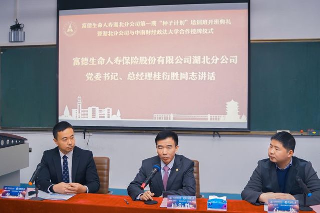 (通讯员 王章)2023年2月22日上午,富德生命人寿湖北分公司主办,我校承办的第一期“种子计划”培训班在南湖校区顺利开班,共有52名学员参加此次培训。学校继续教育学院副院长石龙,金融学院副院长李沛,富德生命人寿湖北分公司党委书记、总经理桂衍胜出席了开班典礼,李沛副院长主持典礼。