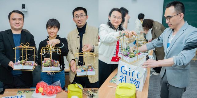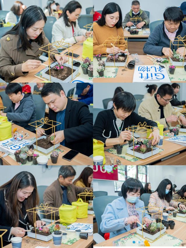 在多肉微景观DIY环节,园艺师首先从多肉的种植、日常护理要点等方面进行了简要介绍,并指导老师们进行别具一格的多肉植物DIY活动,老师们手持小工具饶有趣味地制作起来,剖土、栽种、铺石、装饰……每个人都乐在其中。变身巧手花匠的老师们,尽情释放自己的想象力,打造出一个个各具特色的“纯手工多肉微景观”,温馨的欢声笑语充满了整个教室。