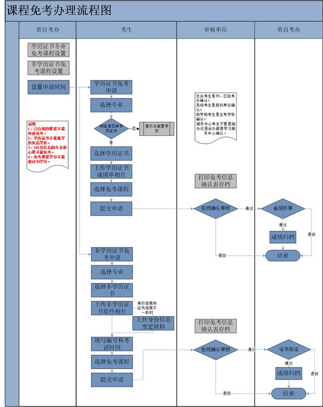 (一)课程免考实行网上申请办理,考生须根据课程免考要求在“考生服务平台”提交相关材料后由考籍所在地进行网上确认。