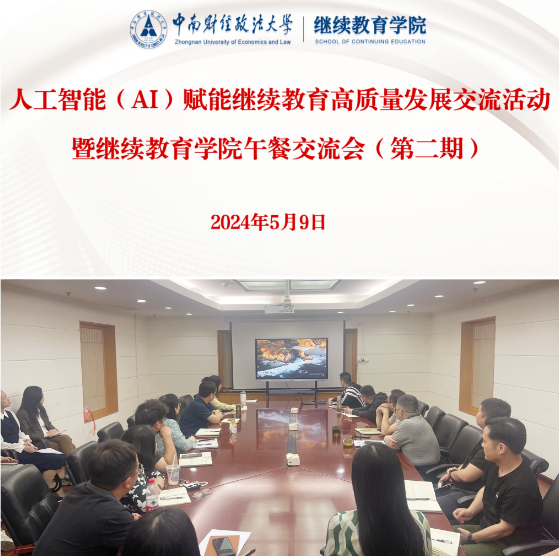 (通讯员 曾诚)ChatGPT和Sora刚问世便火遍全球,反映了人工智能的巨大影响力和无尽潜力。人工智能汇集了人类的集体智慧,但人们也渐渐感受到了它对各行各业的冲击。为增进教职工对人工智能的了解,赋能继续教育事业高质量发展,5月9日在中南楼512会议室继续教育学院举办了第二期教职工午餐交流会。院长赵凯主持活动,全体领导班子、科室负责人及业务骨干参加了活动,学院办公室郑鸣老师作主题分享。