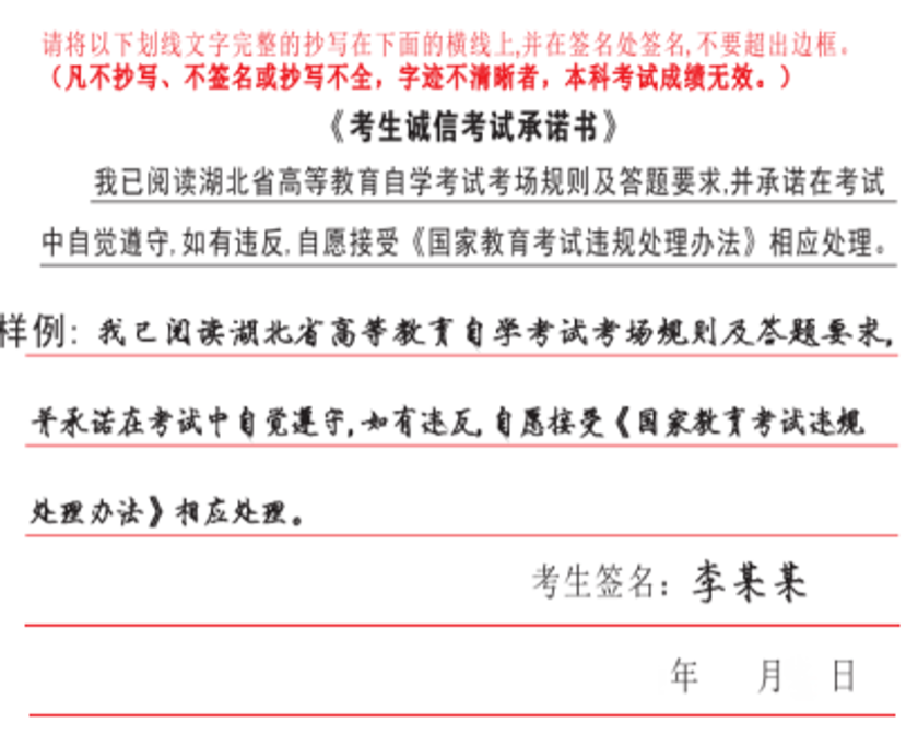 1.落实笔迹信息采集要求。考生应在答题卡指定区域完整抄写《考生诚信考试承诺书》(抄写样例如下图),凡不抄写、不签名或抄写不全,字迹不清晰者,该科考试成绩无效。考生毕业时,省教育考试院将对每张答题卡上的《考生诚信考试承诺书》笔迹进行复核,凡笔迹不一致、经鉴定为代考的,将根据《国家教育考试违规处理办法》作出成绩作废、延迟毕业、记入国家教育考试诚信档案等处理。