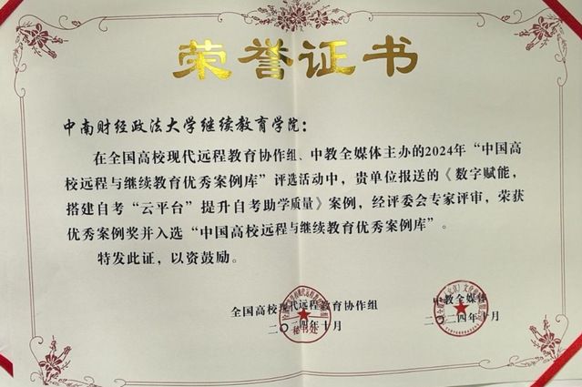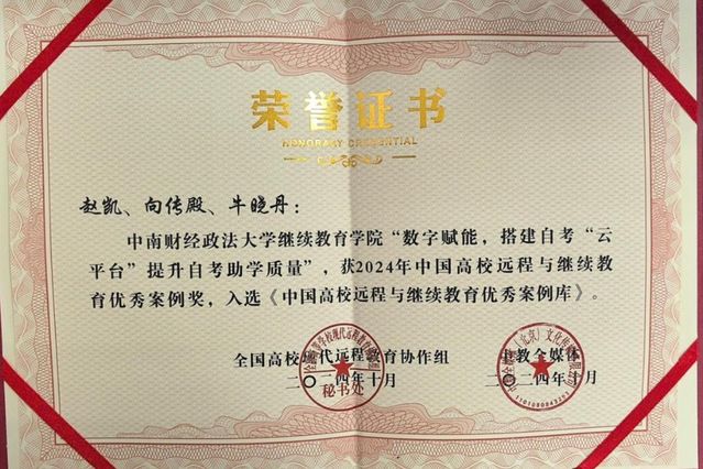 (通讯员 徐杠)近日,在全国高校现代远程教育协作组、中教全媒体主办的2024年“中国高校远程与继续教育优秀案例库”评选活动中,我院报送的《数字赋能,搭建自考助学“云平台”提升自考助学质量》案例,经评委会专家评审,荣获优秀案例奖并入选“中国高校远程与继续教育优秀案例库”。