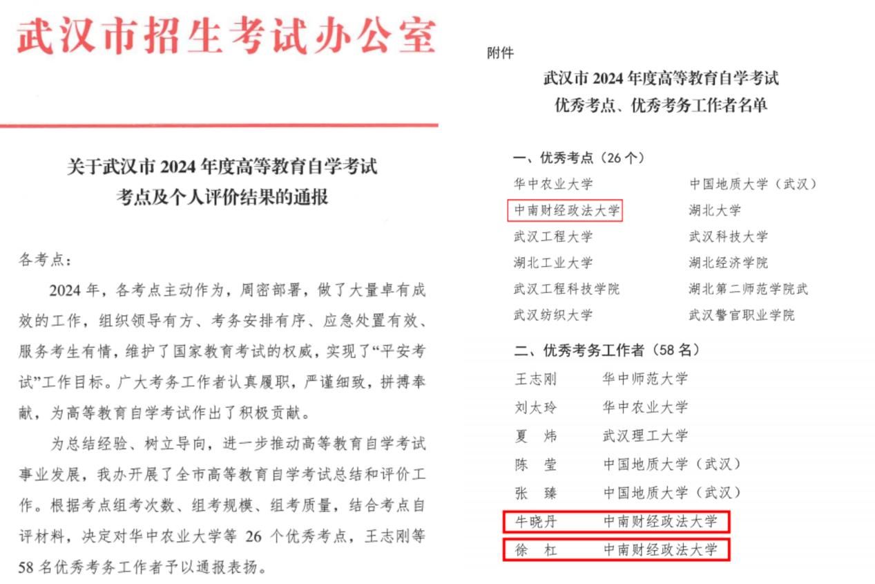 在近日武汉市招生考试办公室发布的《关于武汉市2024年度高等教育自学考试考点及个人评价结果的通报》中,我校被评为武汉市自学考试优秀考点,牛晓丹、徐杠两位同志被评为优秀考务工作者。这也是我校连续多年多人次获得省市殊荣,组考工作得到了主管和业务指导部门,以及广大考生的一致认同。