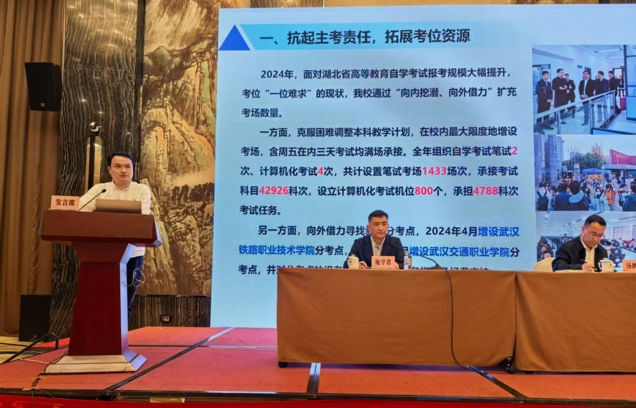 (通讯员 牛晓丹)4月7日下午,武汉市2025年4月份自学考试考务暨巡视工作培训会议在武汉会议中心举行。继续教育学院院长赵凯、副院长向传殿以及自考办主任牛晓丹参加培训会。赵凯院长以《主动扛起主考责任 用心用力用情开展组考工作》为题分享我校在自学考试组考工作中的经验与做法。