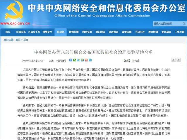 附:中央网信办等八部门联合公布国家智能社会治理实验基地名单-中共中央网络安全和信息化委员会办公室 (cac.gov.cn):http://www.cac.gov.cn/2021-09/29/c_1634507963276896.htm