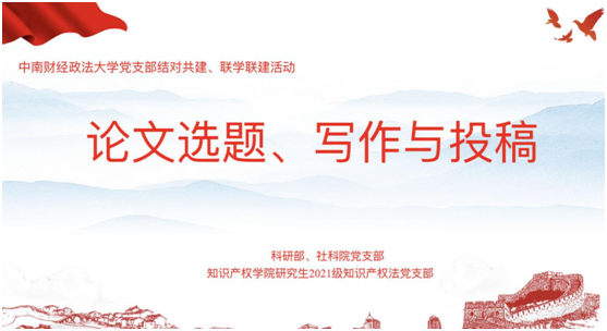 (通讯员 吕普)2022年11月17日和12月8日下午,作为学校党支部结对共建、联学联建活动的一部分,在科研部、社科院党支部的安排下,《法商研究》编辑部何艳同志连续两次面向知识产权学院研究生2021级知识产权法党支部学生党员和入党积极分子开展了以“论文选题、写作与投稿”为主题的讲座活动,面对面指导研究生如何进行论文选题、如何写作论文以及在投稿过程中的注意事项。