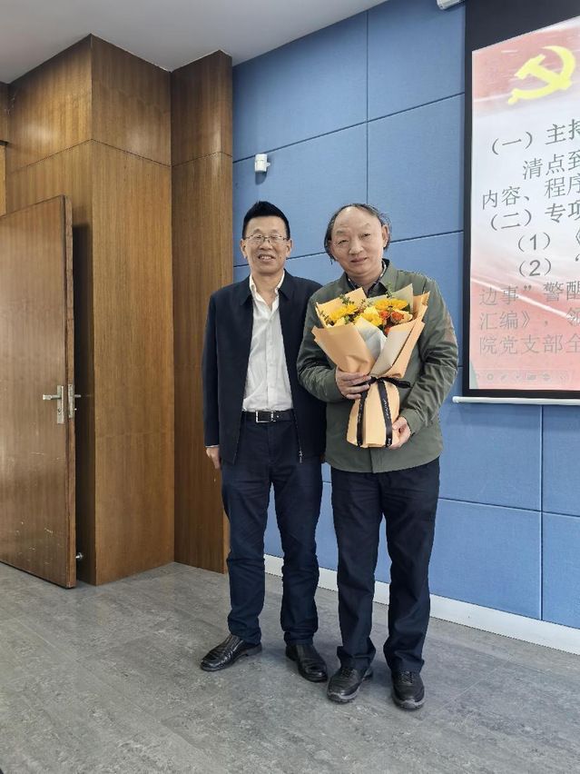 在专项工作环节,支部为《法商研究》编辑部副编审翟中鞠老师举办退休欢送活动,支部副书记张今柯同志简要介绍了翟老师的相关情况,并代表部门领导班子和全体员工向光荣退休的翟老师表示热烈的庆贺和衷心的感谢。翟老师发表了退休感言,回忆了自己在岗位上的奋斗历程,分享了工作的感悟和经验,真挚地表达了感谢。最后,由社科院副院长韩翼同志代表全体员工向翟老师献花。