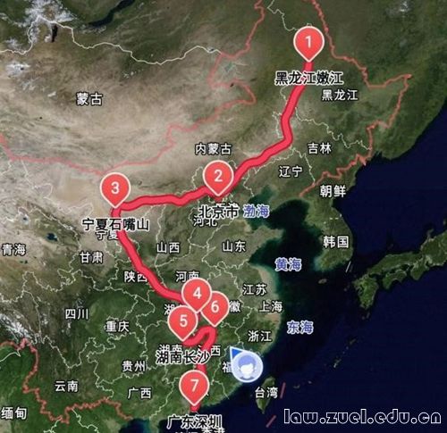 黑龙江嫩江——北京——宁夏石嘴山——湖北武汉——湖南长沙——江西庐山——广东深圳