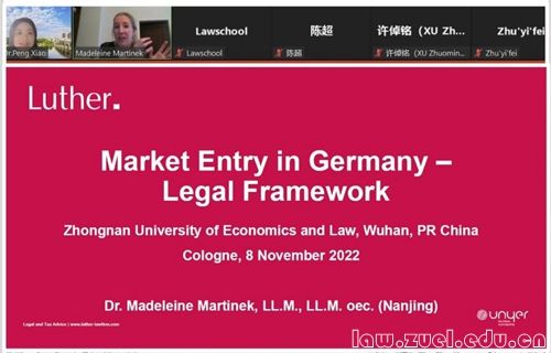 通讯员(胡婷 朱怡菲 徐菁林)11月8日下午,由我院国际法学系肖鹏副教授组织的“全球治理与国际组织人才培养系列讲座第一讲:德国市场准入的法律框架”讲座于线上顺利开展。德国陆德律师事务所律师、原中国政法大学中欧法学院副教授马德莲·马丁内克(Madeleine Martinek)博士受邀作“德国市场准入的法律框架(Legal Framework for Market Entry in Germany)”专题讲座。讲座由肖鹏副教授主持,法科学子们入会聆听。