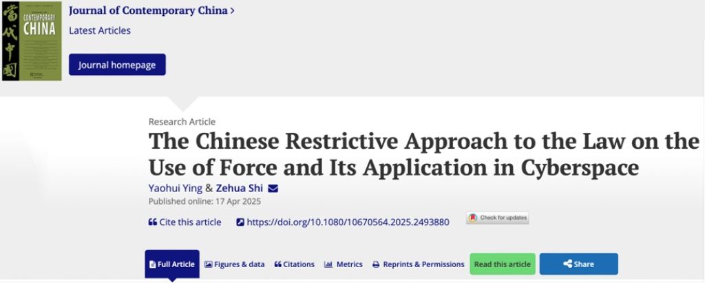 2025年4月,我院青年教师应瑶慧在国际知名学术期刊《当代中国研究》(Journal of Contemporary China)上发表题为“The Chinese Restrictive Approach to the Law on the Use of Force and Its Application in Cyberspace”的长篇论文。文章认为,中国对使用武力的限制性态度主要体现在强调安理会的核心作用、严格解释自卫的时间与目标条件,以及对联合国宪章框架之外的武力使用保持谨慎态度。中国采取限制立场的原因既有内生性因素,源于其自我约束的哲学理念和军事战略,也有外生性因素,受到其在安理会特殊地位的影响。网络行动对使用武力法律框架的挑战,主要体现于网络战争归因困难,作战手段、目标与效果突破传统战争伦理,以及进攻与防御成本不对称所带来的法律模糊性。文章指出,中国在网络空间的相关立场将深受其一贯做法的影响,这种做法体现为既有规则的弹性、战略延续性和战术谨慎。