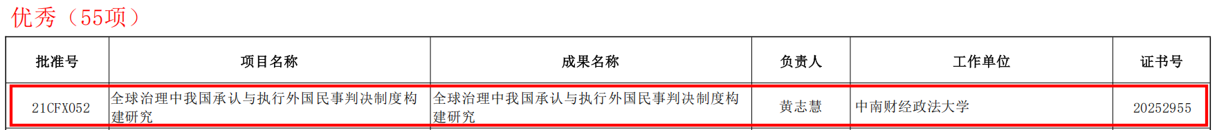 近日,全国哲学社会科学工作办公室发布《2025年8月国家社科基金年度项目结项情况》,我院黄志慧教授主持的国家社科基金项目“全球治理中我国承认与执行外国民事判决制度构建研究”(编号:21CFX052)顺利结项,并获评“优秀”等级。