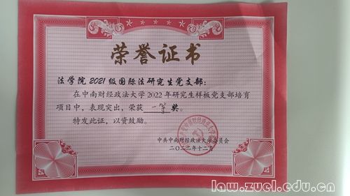 法学院2021级研究生国际法党支部成立以来,一直以“全面提升支部理论、专业、实践水平,培养具有家国情怀、国际视野、专业素养的高素质法学专业人才,建设组织健全、活动丰富、积极向上的研究生党支部”为目标,不断探索“党建+专业”的工作模式,在规范组织生活、创新活动形式等方面表现突出。经过一年多的建设,支部党员信念坚定,实践成果突出;党员专业素质不断提升,“党建+专业”效能初步显现;支部建设更加扎实,凝聚力、战斗力不断提升。