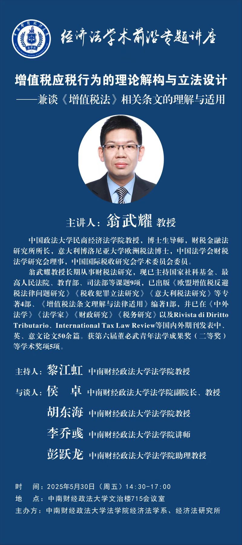 Academic Frontier Seminar on Economic Law | Weng Wuyao: Theoretical Deconstruction and Legislative Design of Value-Added Taxable Behavior