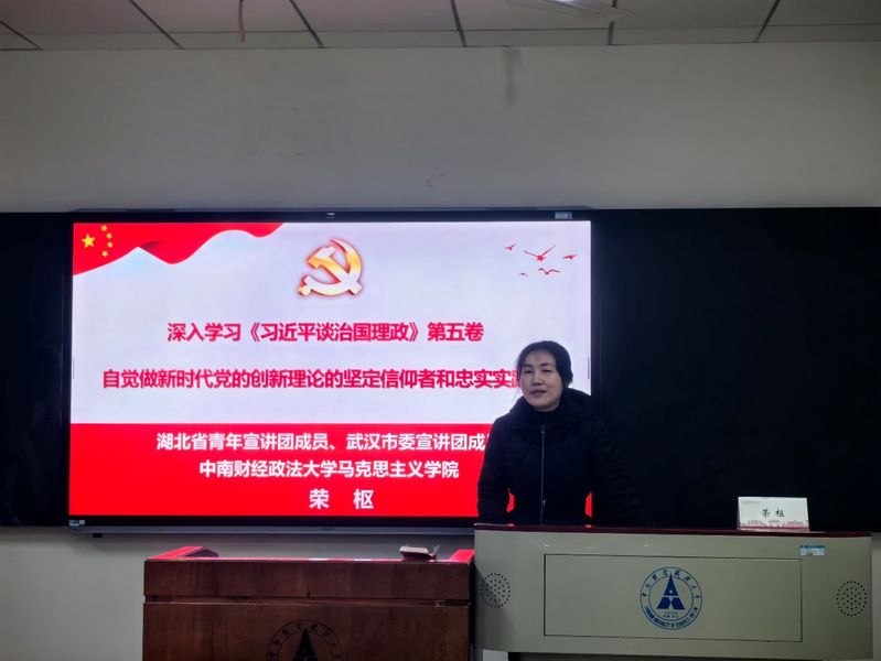 荣枢教授作为湖北省青年宣讲团、武汉市委宣讲团成员,长期深耕马克思主义理论研究与宣讲工作,有着深厚的学术造诣和丰富的授课经验。党课上,她围绕《习近平谈治国理政》第五卷的丰富内容、重大意义和实践要求三大核心板块展开系统阐释。在内容解读上,详细介绍了该书收录的2022年 5月至 2024 年12 月期间习近平总书记的 91 篇重要著作及18个专题框架,梳理了其与前四卷一脉相承又与时俱进的内在逻辑;在意义阐释上,从对党的创新理论、马克思主义基本理论、中华优秀传统文化创新转化的三重发展维度,深刻阐明了著作的理论价值与世界意义;在实践要求上,强调要将著作作为政治引领的 “方向标”、破解难题的 “金钥匙”、推动发展的 “指南针” 和自我革命的 “正衣镜”,切实把学习成效转化为工作实效。