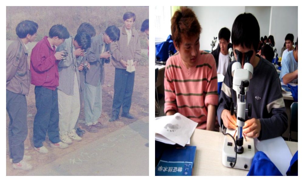 公安学系学生正在进行现场勘察实验和痕迹检验实验