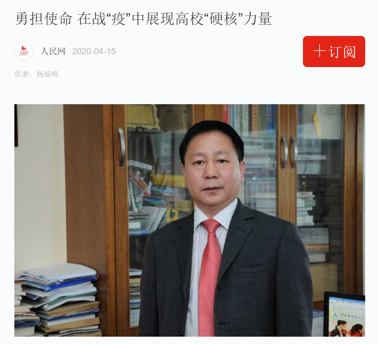 新闻网讯(通讯员 崔桢桢)4月15日,人民网刊发校党委副书记、校长杨灿明文章《勇担使命 在战“疫”中展现高校“硬核”力量》,“学习强国”平台转载。